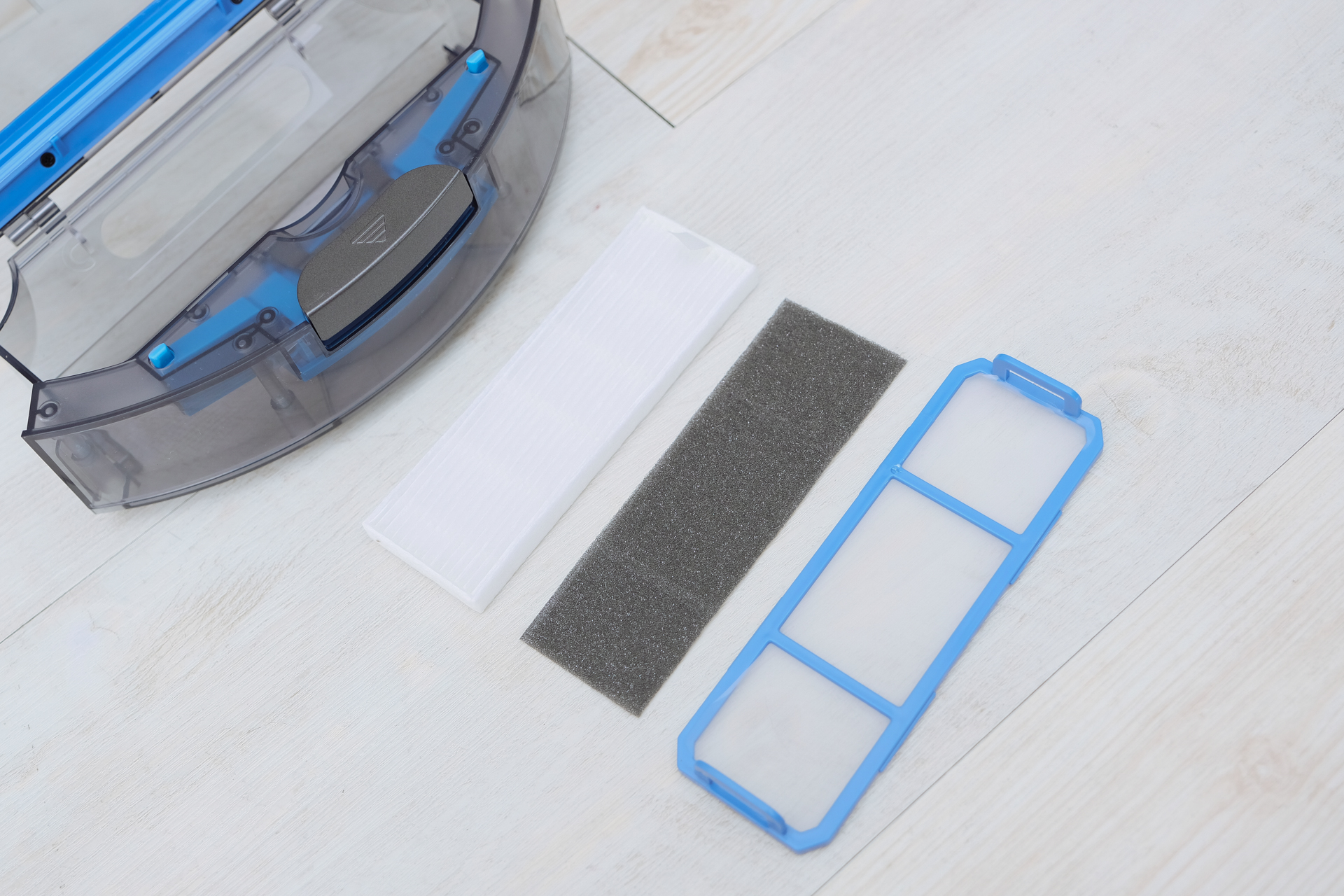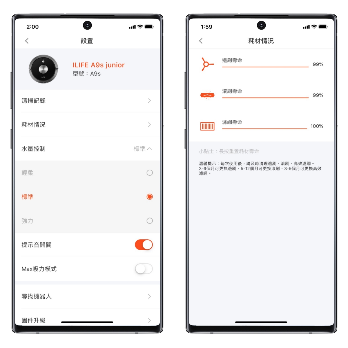 水箱出水量有三段可以控制,不論是哪一段都不用擔心地板會太濕,阿湯覺得就算選擇出水量最大,拖過去的地板也僅是微濕,不會到讓你滑倒的地步,也因為有三段的水量控制,讓你可以自行調整適用於各種不同的地板材質(例如木地板就可以水量選擇少一點避受潮),在 APP 裡也會有邊刷、滾刷、濾網的使用壽命預估,該更換時也會通知你。