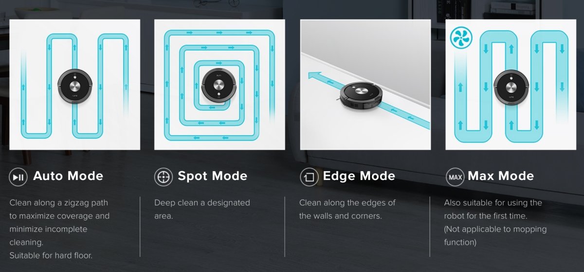 清掃模式除了自動弓形路徑清掃外,還有重點清潔、沿邊模式及強力模式,可以依據不同需求選擇對應的清掃模式,更快且更乾淨的完成區域清掃。