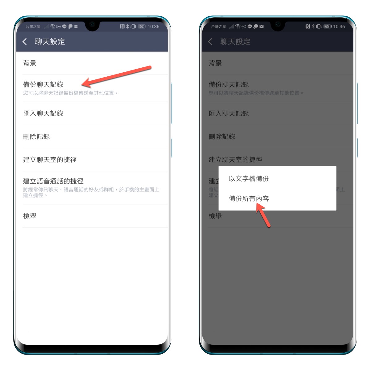 然後「備份聊天記錄」>「備份所有內容」,記得,所有的想要備份並轉移的聊天記錄都要做一次備份聊天記錄,這是最麻煩的地方,如果你有 50 個聊天視窗想轉移,那就是要做這個動作 50 次,不要懷疑人生,就是這麼麻煩。