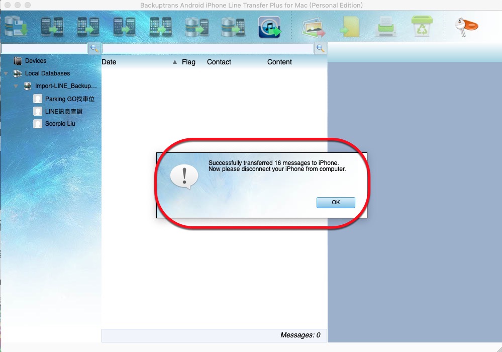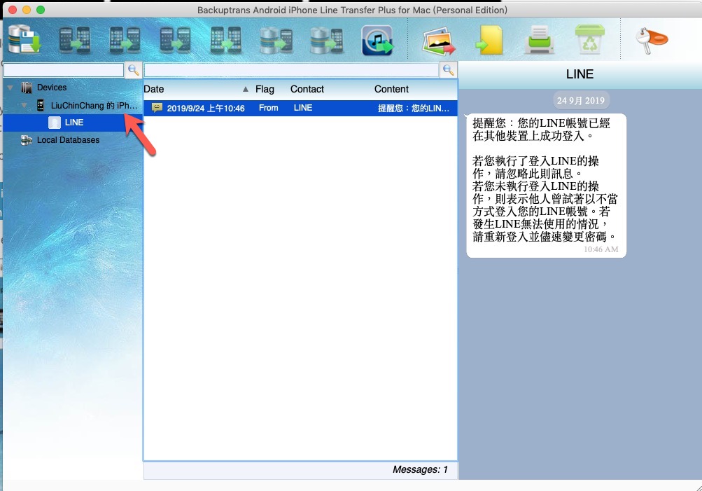 這邊就會看到你原本在 LINE 裡的訊息都匯入了,然後一樣在資料庫那右鍵「Transfer Messages from Database to iPhone」。