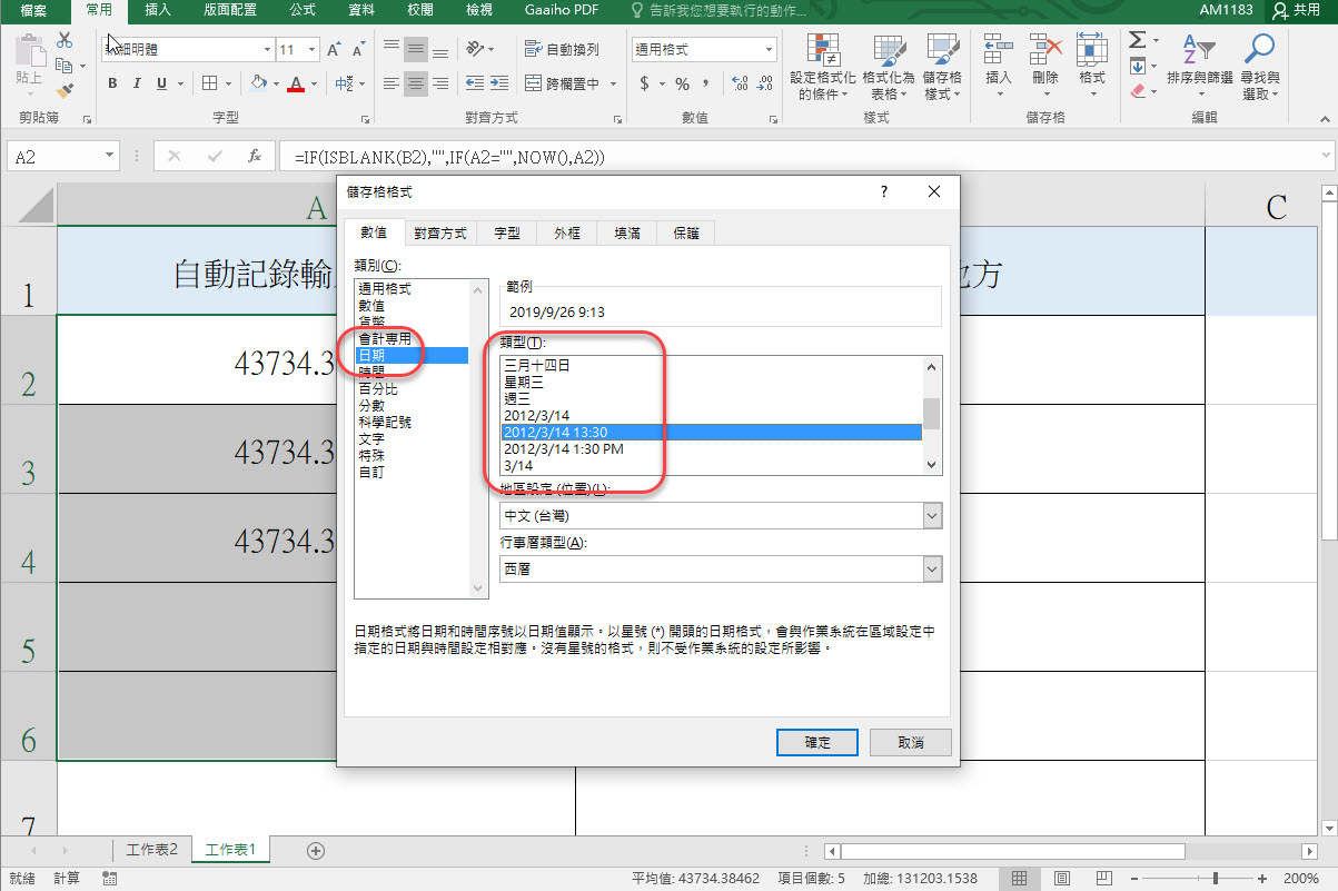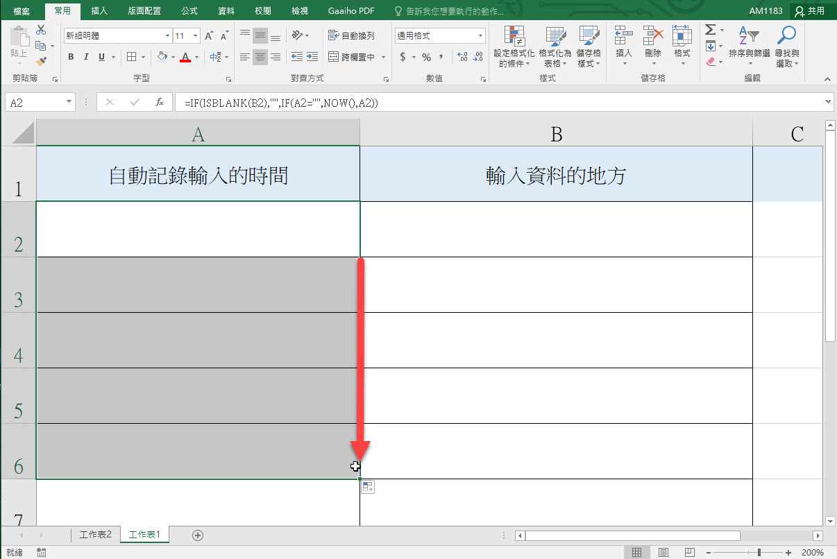 說明一下,第一個是判斷 B2 是否為空白,是的話就不顯示內容,如果不是就進行第二個 IF 判斷式,先判斷 A2 是否為空白,如果是的話,則顯示 NOW() 也就是目前的時間,而我們剛剛勾選的反覆運算設定為 1,就是讓 NOW 只進行一次計算,記錄下時間,不會再變動,因為 NOW 這個公式當你重開 Excel 檔案時預設是會再更新為目前的時間的。