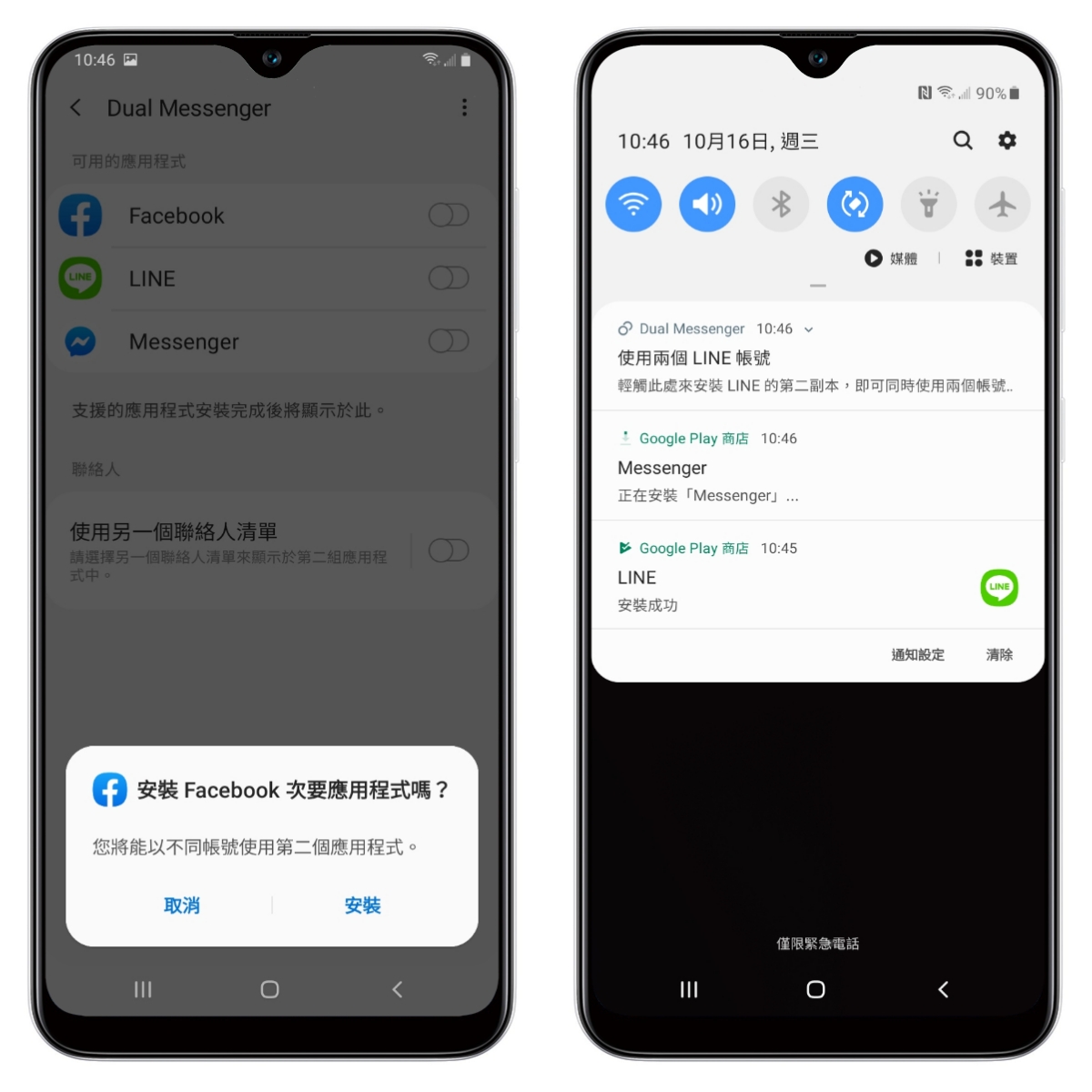 如果你安裝的 APP 可以使用 Dual Messenger 也會跳出提醒,詢問你是否要安裝第二副本。