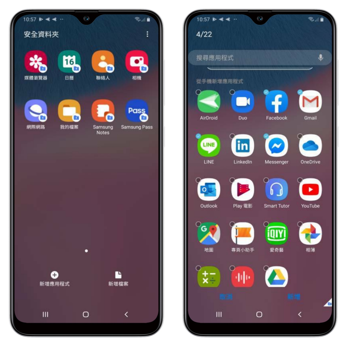 透過安全資料夾,你可以選擇要新增的應用程式,這裡所有新增的應用程式都會是跟新安裝的一樣,你就可以在這裡面登入第三個帳號,或者你壓根就對社群很講求隱私的話,也可以只在安全資料夾裡使用主帳號,完全不會被他人查看。