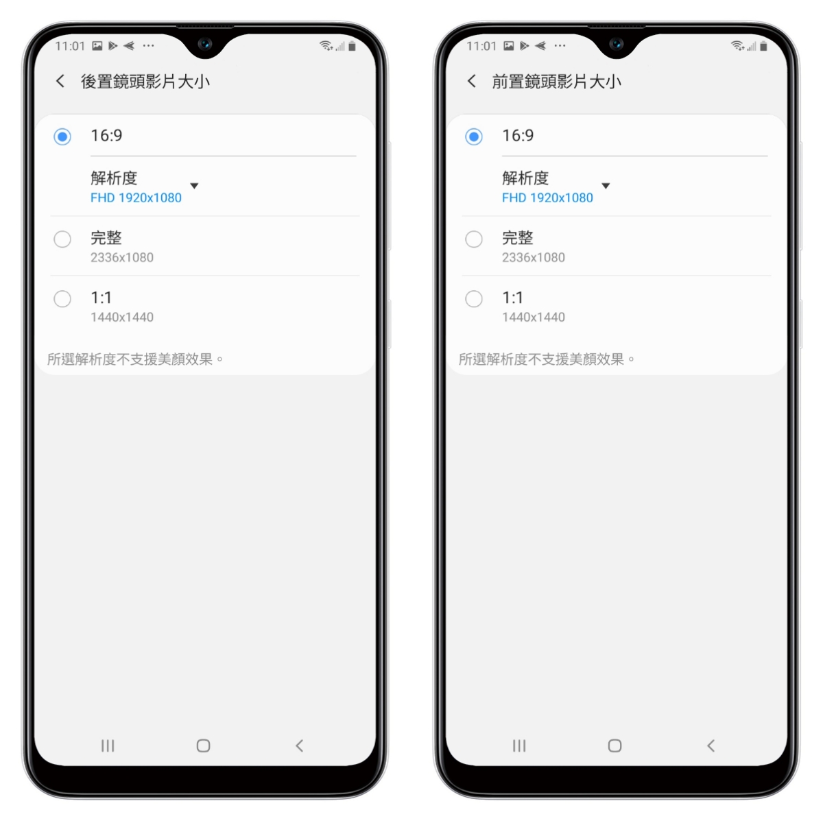 不論前置或後置鏡頭,能拍攝的影片解析度都是一樣的,除了常用的 Full HD 外,也能拍攝更窄畫面的 2336x1080。