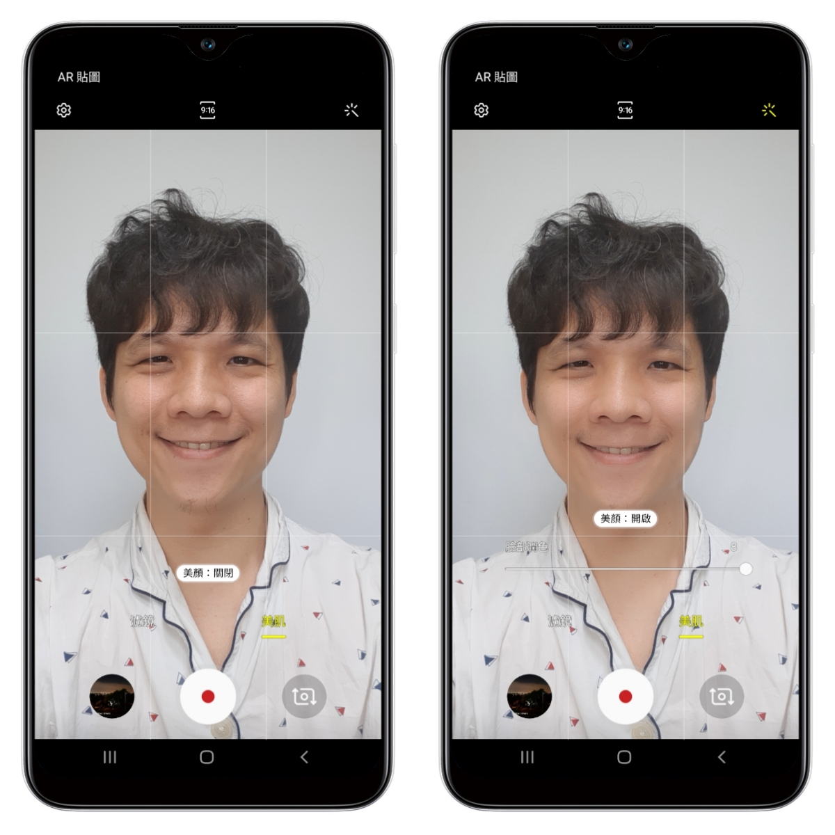 這邊也提供大家一小段美顏錄影的效果比較,在影片由左至右分別是不開啟美顏、開啟等級 50%、開啟等級 100%,可以看到臉部的皮膚在美肌開愈大時,柔焦的更明顯,皮膚看起來超好。
