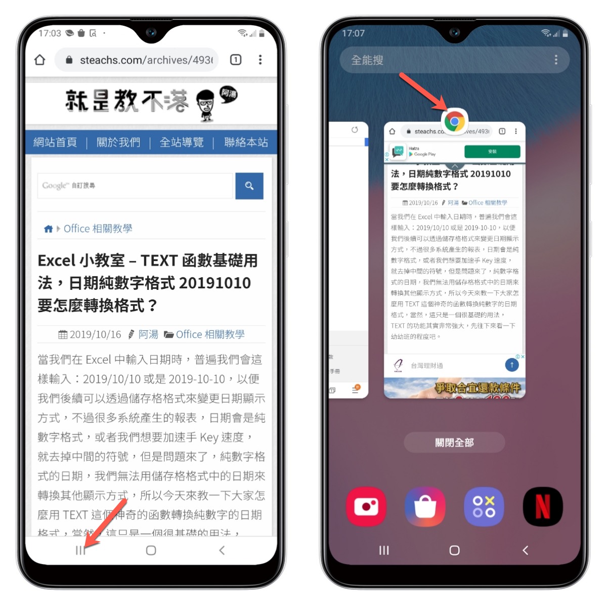 Galaxy A30s 支援多重視窗功能,想要使用的話,只要先開啟過二個你想要顯示在多重視窗上的 APP,然後點擊左下角的多工視窗按鍵,在要做為上方視窗操作的 APP 圖示按一下。
