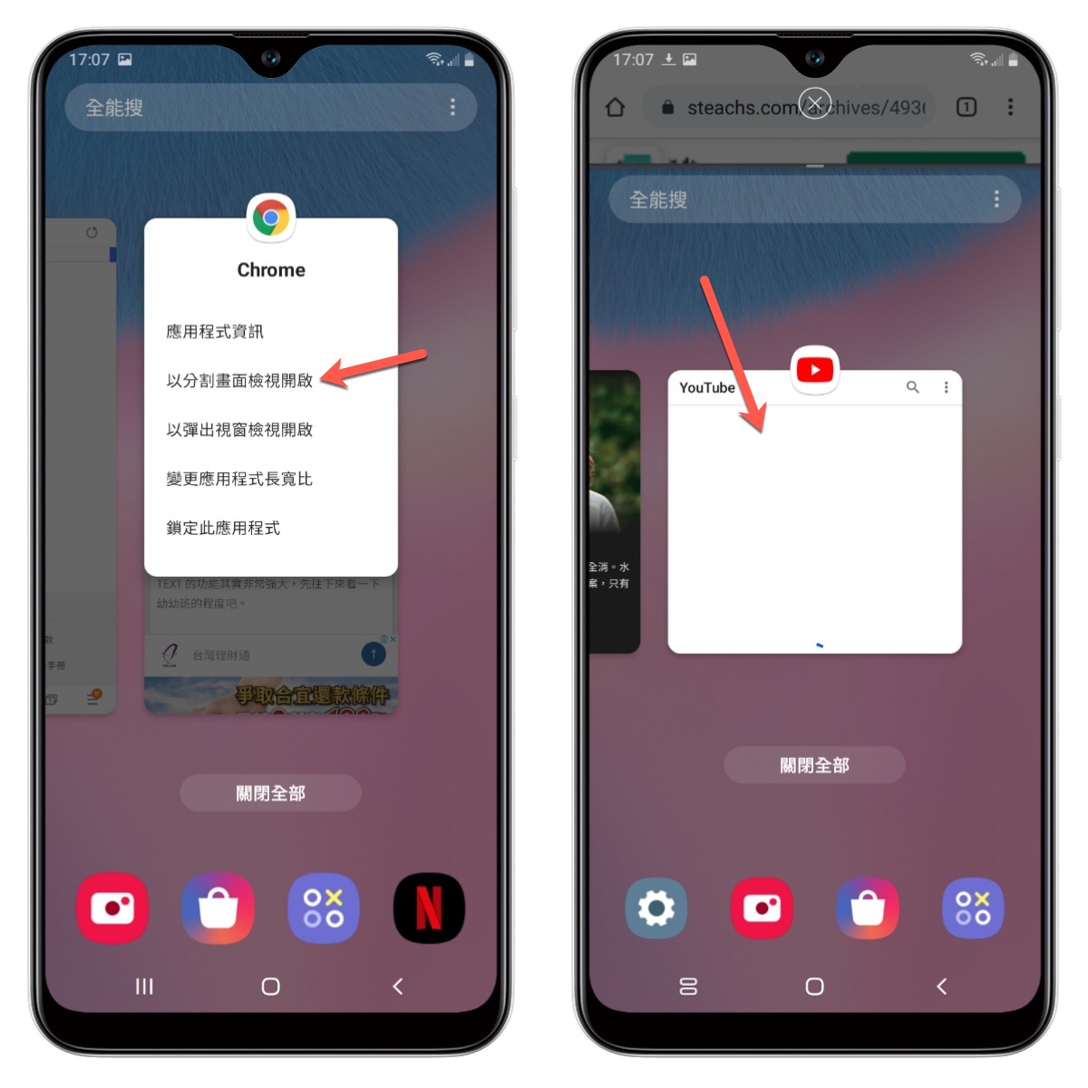 再點擊「以分割畫面檢視開啟」,然後再選擇下方視窗要操作的 APP,就搞定了。
