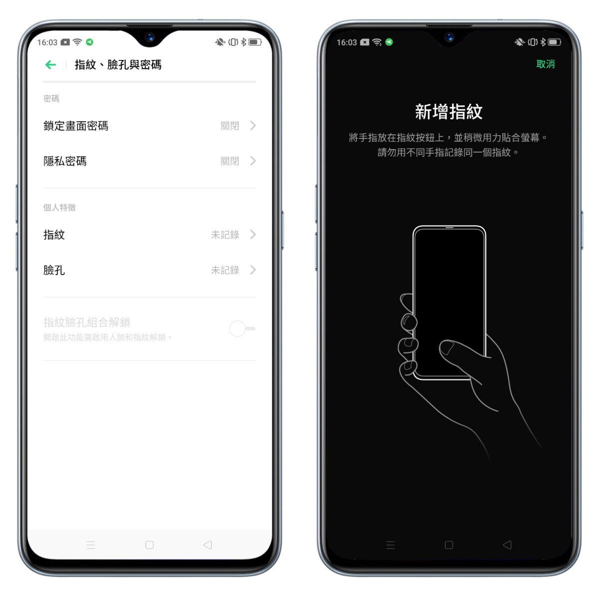 安全性的部份同時支援指紋辨識及臉部辨識解鎖,而且可以設定同時啟用,在解鎖時以任一方法都可以。