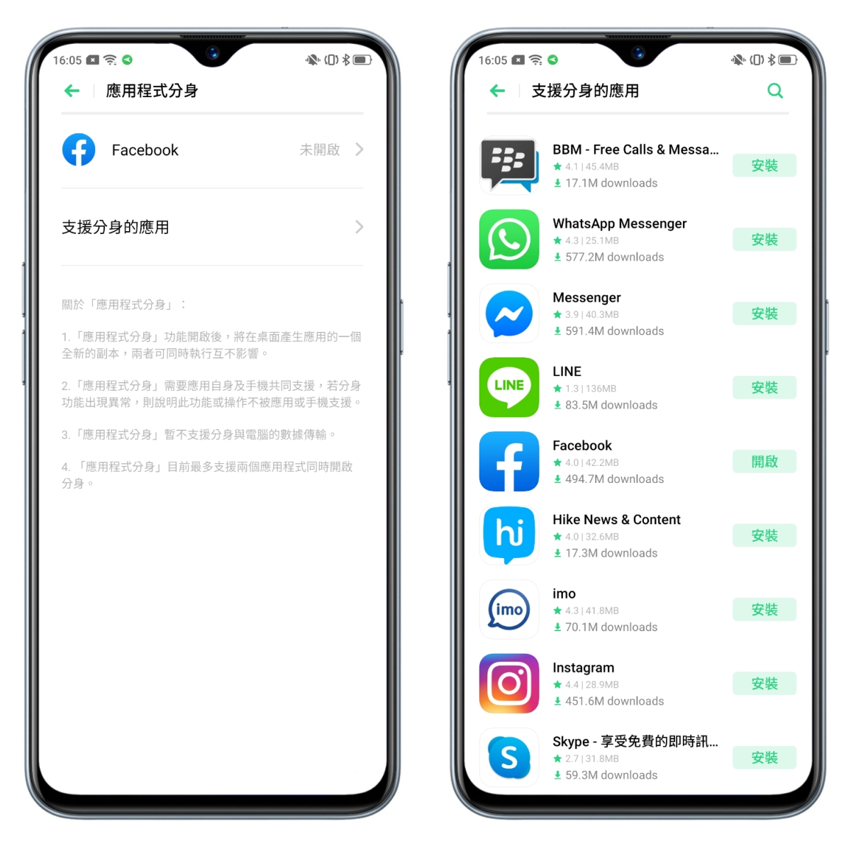 需要 APP 雙開的話,可以使用應用程式分身功能,常用的 Facebook、Messenger、LINE 等都有支援。