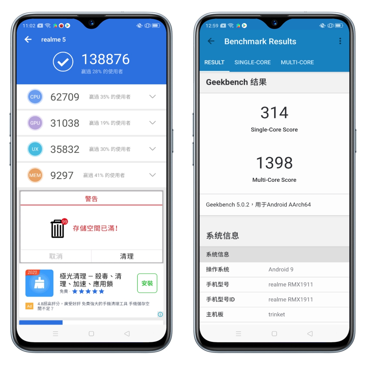 系統介面與相關功能由於 realme 全系列目前都是採用 ColorOS 系統,可以直接參考阿湯已經分享過的 realme XT 開箱:請點我前往。 透過安兔兔測試獲得 138876。 GeekBenchmark 5:單核為 314,多核為 1398。 大概講一下效能的部份,雖然這是非常平價的機種,但是阿湯試玩了一下 FreeFire 及傳說對決,仍然沒有太大問題,基本上全程都還是維持在一定的順暢度及操作反應,所以玩遊戲也是沒問題的(當然那順暢感跟反應速度,還是跟中高階機種或旗艦機有明顯差別,但我認為一般這樣玩是可以接受的程度)。