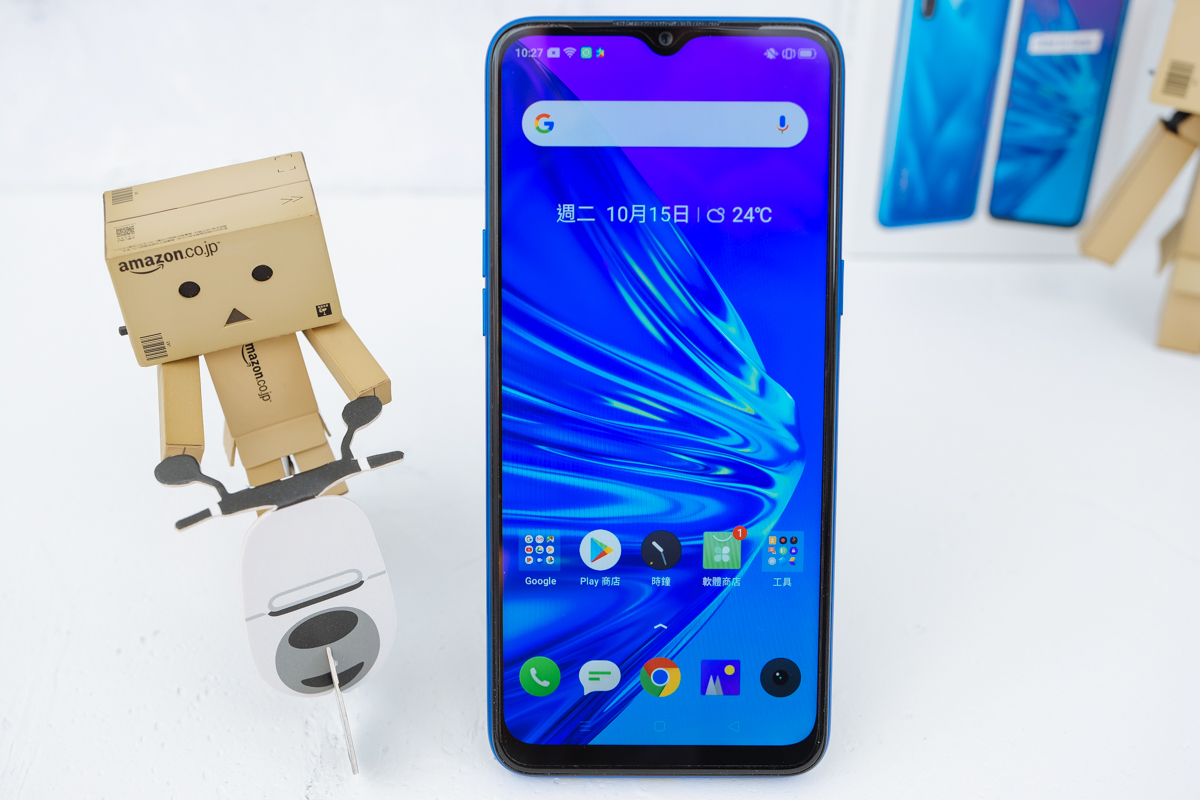 與 realme XT 幾乎是一模一樣的外型,都是採用水滴設計螢幕,不過畢竟 realme 5 相較於 realme XT 又再更加平價不少,當然外觀設計實際拿起來還是可以感受到不同的,除了機身較厚一些外,螢幕下方留黑處也較厚一些,不過 realme 5 的電量也高上不少就是。