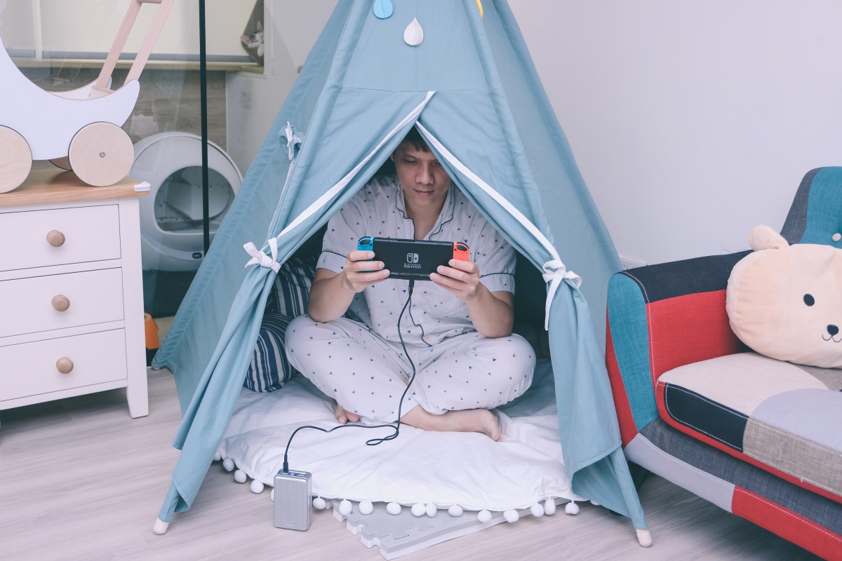 上飛機必備的消磨時間神器 Switch 也能邊充邊玩,我現在在家有時也會接行動電源玩 Switch,為什麼不用電視玩呢?因為會被我兒湯包看到,哈哈哈哈。