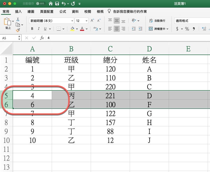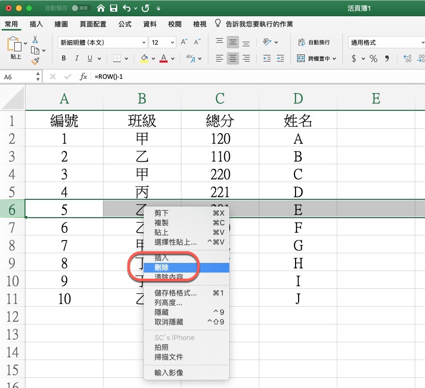 來個簡單的範例,假設這是我今天要做為範例的資料,可以看到編號欄是 1~10,如果我今天刪除編號 5 那行後會發生什麼事?
