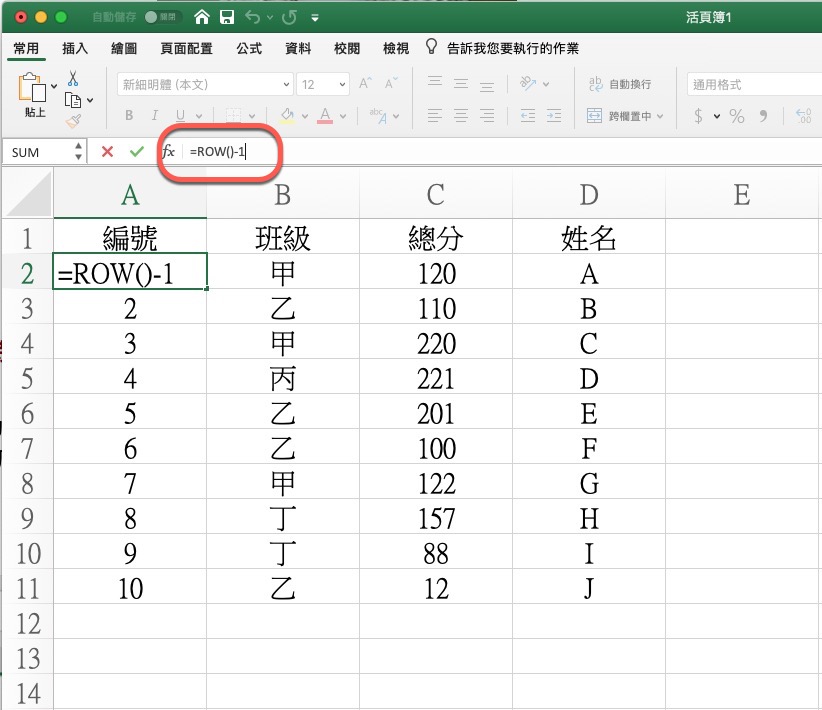 =ROW()-1簡單說明一下,ROW() 是用來顯示當下該欄位的列數字為多少,像阿湯的第一個是 2,所以後面固定就是 -1,那麼就會變成編號 1,再將公式往下拉就可以了。