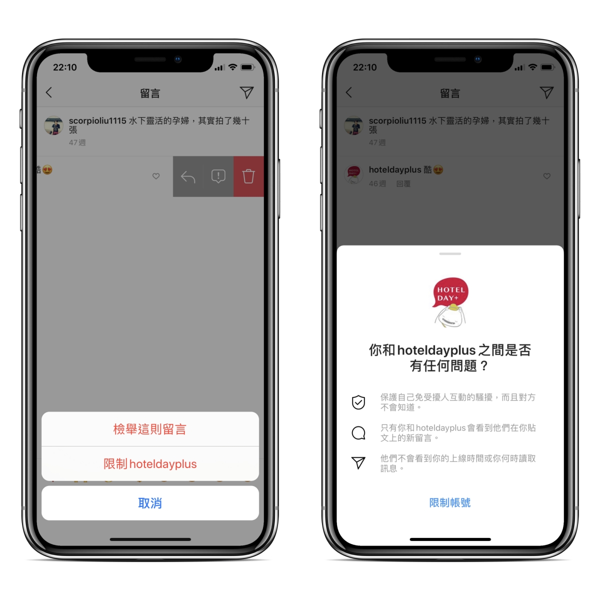 阿湯分別各別先講一下 iOS 及 Android 上要怎麼使用,以 iPhone 來說,在想要限制的留言往左滑動後,就可以選擇限制某人,然後點擊限制帳號,這樣就完成了,如果要取消限制,最快的方法就是回到該則留言一樣往左滑就可以取消。