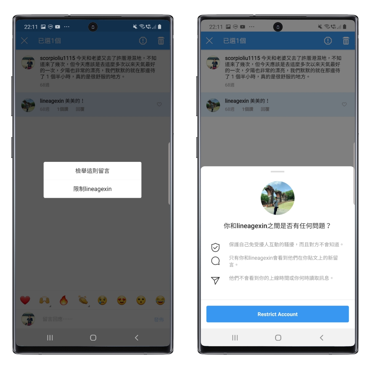 Android 的部份和 iPhone 差不多,主要差在留言是長按,然後選取限制,然後點擊限制帳號就可以。