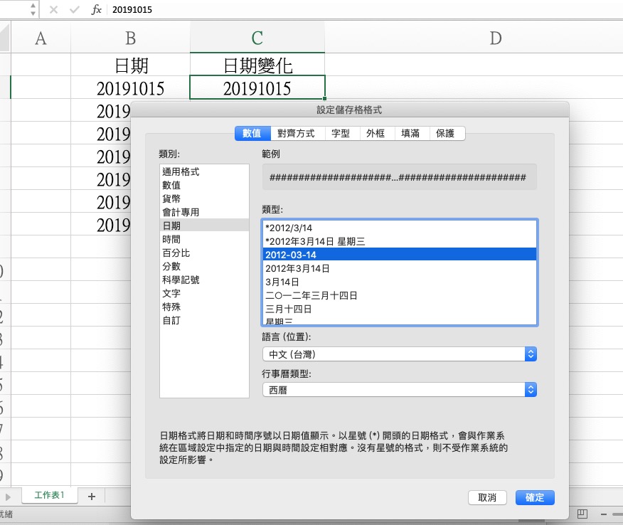 當我們選擇任一個日期格式,你會看到範例那欄都變成了無限個 ######。