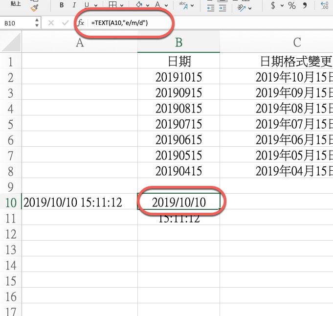 如果你的日期格式有包括時間,或者你想要替換日期順序等,以下圖 A10 的範例來說,由於是標準日期格式,你可以用 e、m、d 這三個參數來各別代表年月日取出使用,所以就可以用這樣的方式將日期、時間拆分,或者重新排序年月日的順序使用。