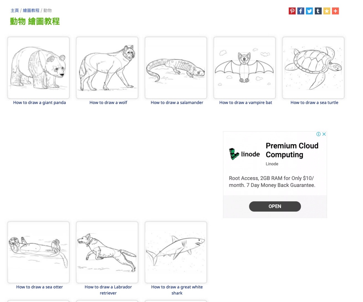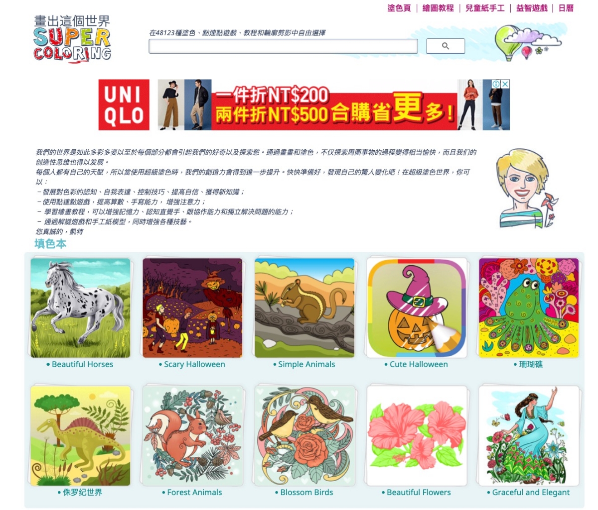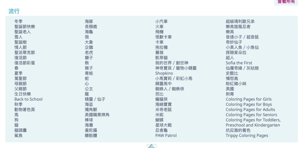 進入網站後,右上角可以選擇塗色頁(就是著色本)、繪圖教學、紙手工或遊戲,也可以直接在首頁搜尋想要著色的內容,這網站裡主要是動物很多,當然還有不少物品等。