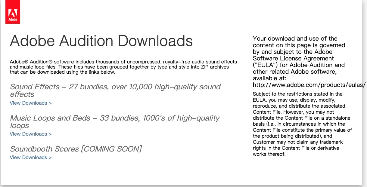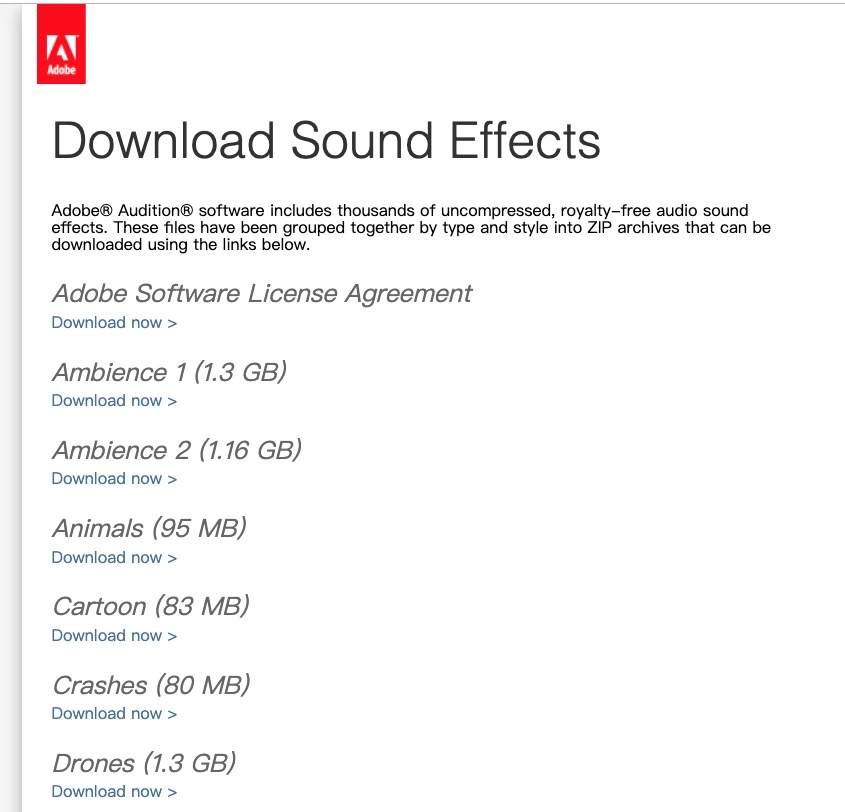 阿湯目前在剪輯影片上,使用了不少來自 YouTube 音效庫的檔案,不過前陣子就發生了有原作者開始收費的狀況,其實還是要找個第二備用音效庫比較好,除了 YouTube 之外,要有這麼大量免費音效/音樂素材的網站可以說是很少,普遍是收費制的,但其實在 Adobe 的網站上,Adobe Audition 提供了超過 1 萬個音效/音樂檔案供大家免費使用,而且可以商用,不需要註冊就能直接下載,除了不能線上預覽以外,基本上真的是蠻佛心來著(以 Adobe 來說啦)。