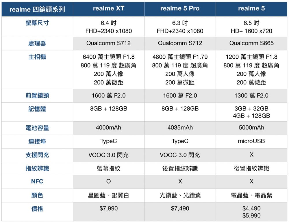 率先開賣的 realme XT,在規格上搭載 Qualcomm Snapdragon 712 處理器,搭載 Samsung GW1 感光元件,擁有手機市場最高畫素的相機 ─ 6400 萬畫素四鏡頭,另外三顆鏡頭分別為能夠帶來 1.5 倍寬廣的視野,並透過廣角優化引擎,自動校正邊緣失真的 119°超廣角鏡頭;微距鏡頭帶來 4cm 的超近對焦距離,而人像鏡頭則是透過智慧 HDR 為照片帶來保留更多亮部與暗部細節。
