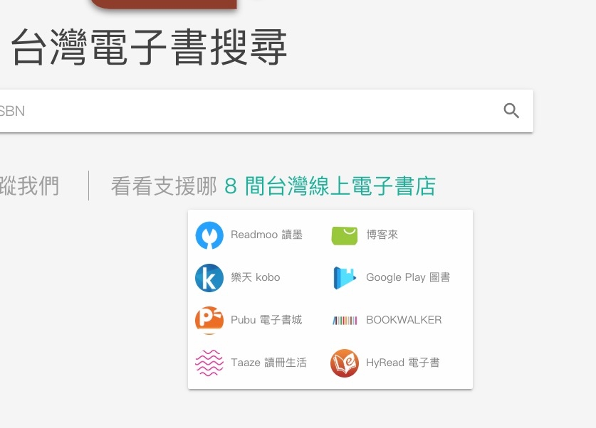 阿湯自己手邊有二台電子書閱讀器,分別是 Readmoo 及樂天 Kobo 的,原因就是二家的電子書籍會有一些不同,可能在 A 家買的到,B 家沒有,所以為了想看的書就會分開買,但如果你是用手機或平板看書就沒這些困擾,唯一困擾是同一本書應該去哪裡買最便宜,或是哪一些電子書店上有賣,現在你可以透過「台灣電子書搜尋」來找書,直接就列出八家書店包括有 Readmoo、博客來、樂天 Kobo、Google Play、Pubu、BookWalker、讀冊生活及 Hyread,基本上這八家應該就是大家目前最常買的地方了。