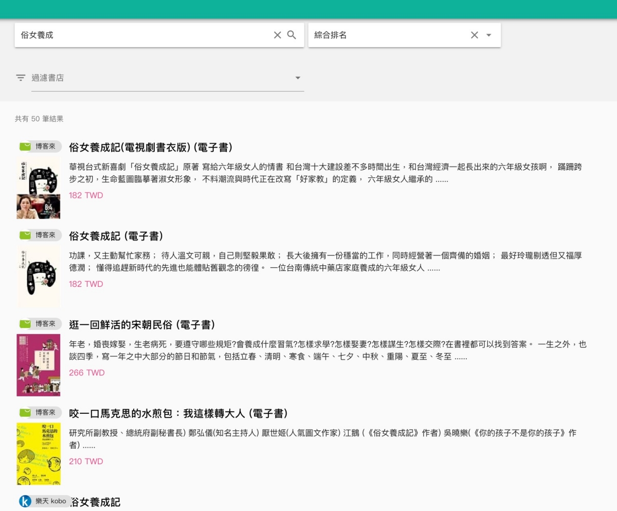 搜尋書名後,右邊可以依價格排名,也可以過濾書店,這樣很快就能找到你想買的書店以及書籍了,不用花時間比價跟一間一間搜尋,真的很方便。