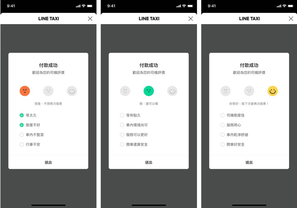 當行程結束後將會出現「評分機制」,乘客可以根據此趟行程的感受,來勾選相對應的圖案與理由,當然司機也可以評比乘客哦!
