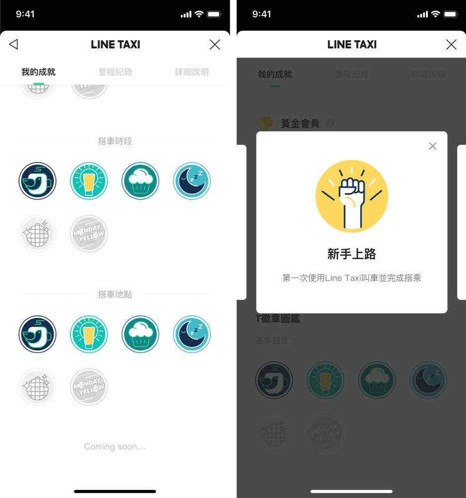 徽章目前分別有四大類「搖滾輪胎–基本設定」、「閃光燈殼–功能探索」、「嗶嗶計費錶–叫車時段」、「衛星導航趴趴走–上車地址」,讓行程除了安全快速到達目的地外,還多了份收集徽章的樂趣。