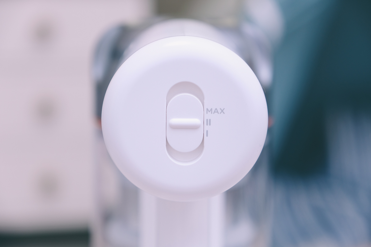 吸力一共分為三段,分別是節能模式、一般模式及 Max 最大吸力模式,一般吸地板我覺得中間第二段的一般模式就很夠用,Max 主要可以用於吸床墊的塵蟎或是較大顆粒的垃圾、灰塵。
