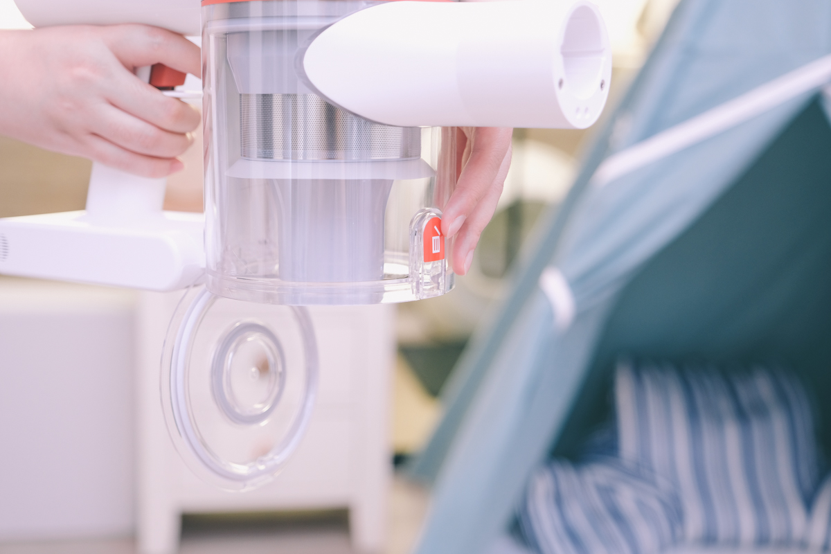 另外倒垃圾的設計上,目前大多不外乎是透過推或拉的方式來開啟居多,V9P 這款則是「按」的方式,輕按一下集塵桶蓋就會彈出,垃圾就直接往下傾倒,完全不會沾手。