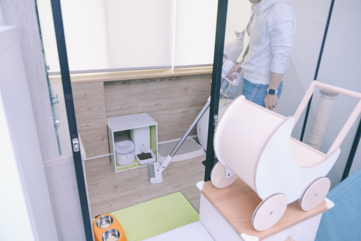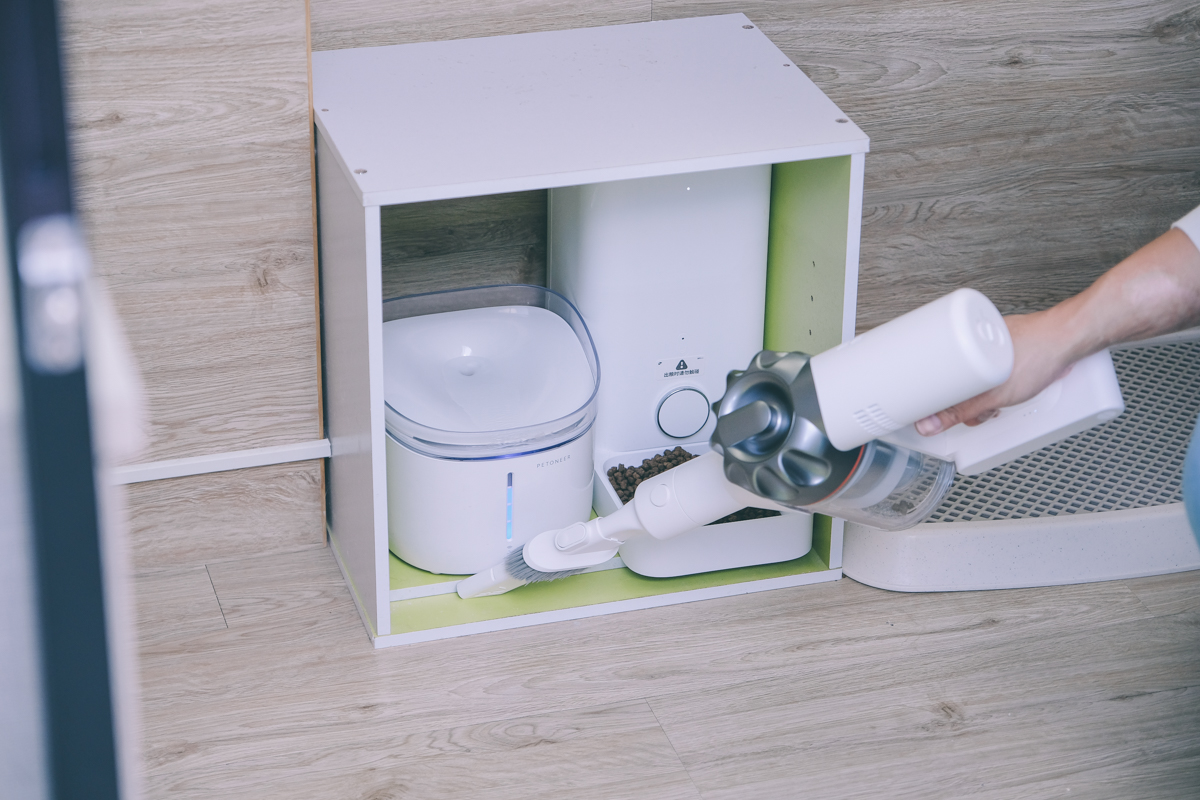 利用軟絨主吸頭 + 二合一毛刷清理貓屋,吸力選擇一般模式,已經足以吸起大部份髒污,共費時 5 分鐘。