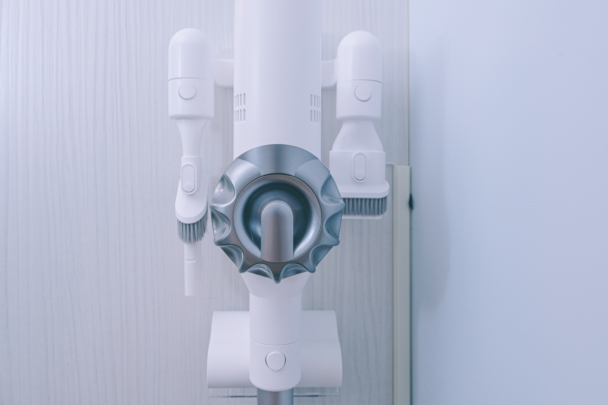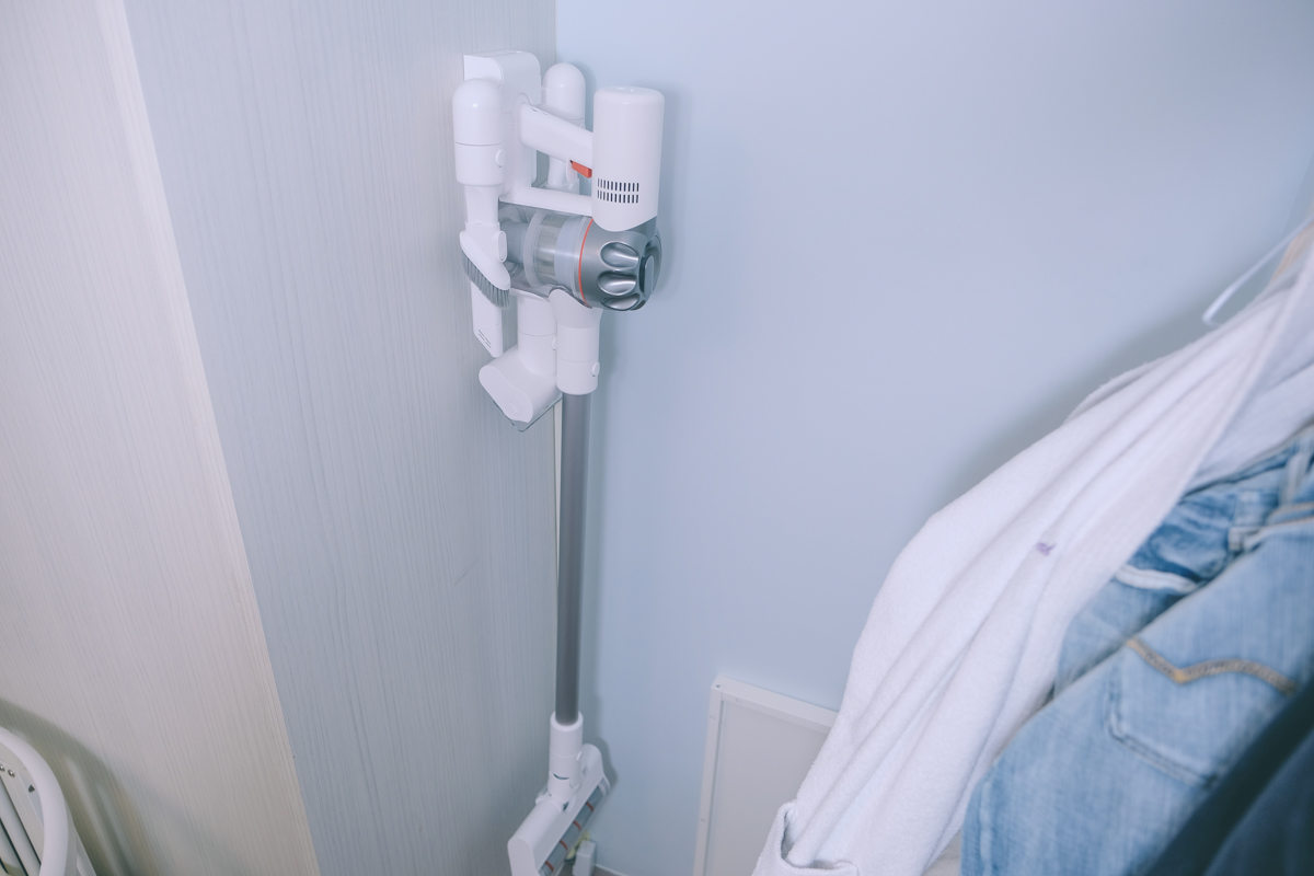 壁掛充電座的部份,安裝就二顆螺絲很簡單,雖然壁掛充電座很多家的吸塵器都有,不過 V9P 的充電座做的比較完善,因為提供了三組吸頭收納座,標配一共有四組吸頭,除了主吸頭直接放在主機上外,另外就剛好三組吸頭都能直接收納在充電座,相當方便,不用再另外找地方收吸頭了。