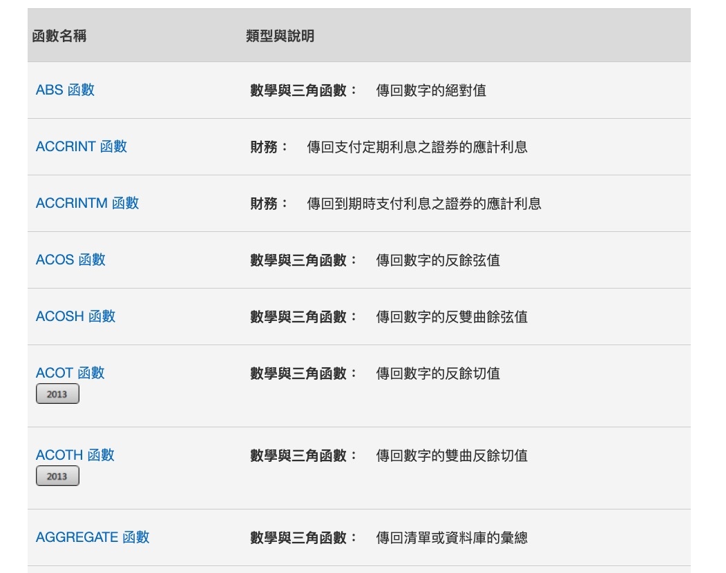 除了照字母排序外,你還可以看到有些函數的下方還有版本的數字,比如 2013,就代表該函數是在 Office 2013 版本後才新增的,每個函數的後方也都有基本說明,讓你了解該函數基本功能是什麼,當 Excel 遇到瓶頸時或許來找找就會有答案。
