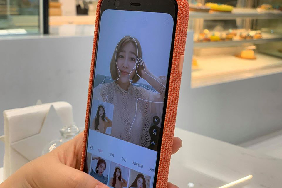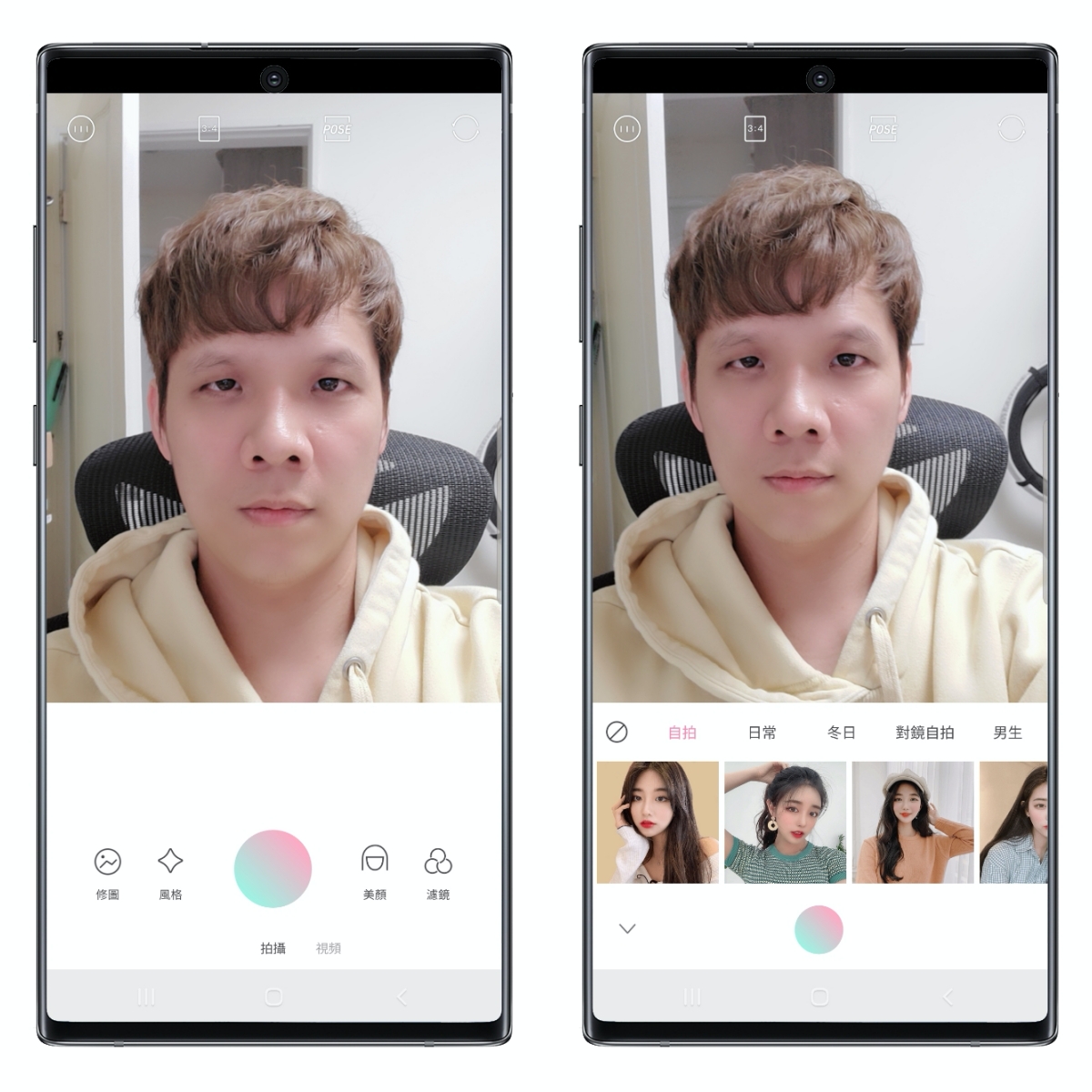 進入到 Ulike APP 後,一般正常使用就是像這樣,單純的美顏或濾鏡套用等,但如果想挑戰一下網美的姿勢,可以點擊上方的 POSE 功能,就會出現了。