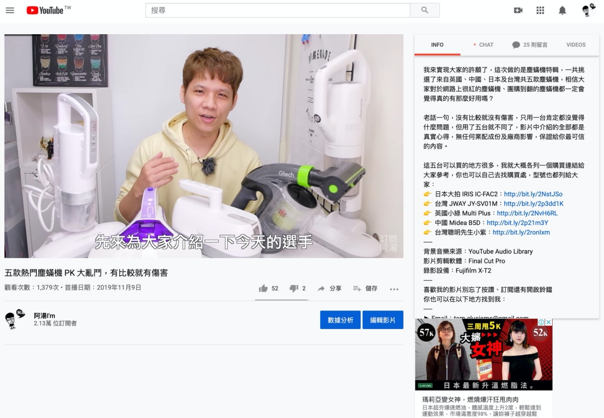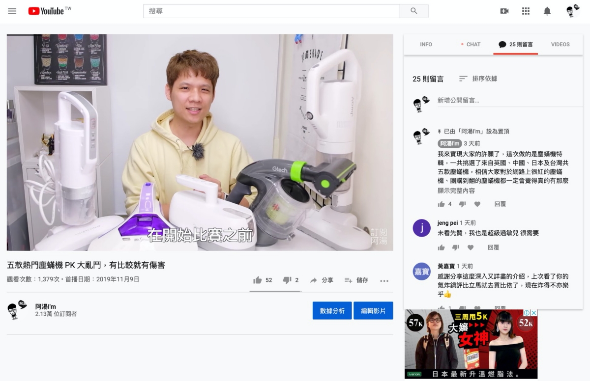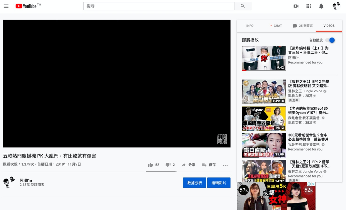 然後回到 YouTube 重新整理頁面,你會發現資訊欄跑到影片右側了,而且用分頁的方式幫你分類好影片的各種內容,包括資訊欄、直播或首播聊天室內容、留言及推薦影片。