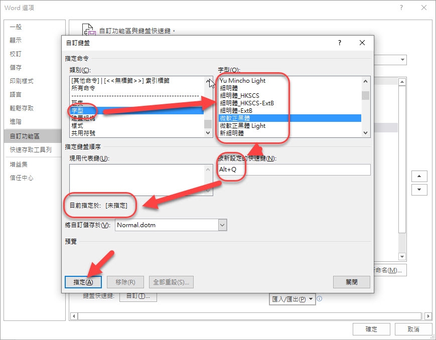 在類別中找到字型,右側就可以選擇你想要自訂快捷鍵的字型,然後在快速鍵欄位點一下後,就可以按壓你想使用的快速鍵,比如「Alt+Q」,這時你可以看一下左邊的提示,如果出現「目前指定於:未指定」的話,只要看到未指定,代表你設定的這個快捷徑沒有重疊到其他功能,可以使用,就可以按下指定完成設定,可以用這樣的方法多設定幾個你常用的字型,之後在選擇字型時就不用下拉找半天了。
