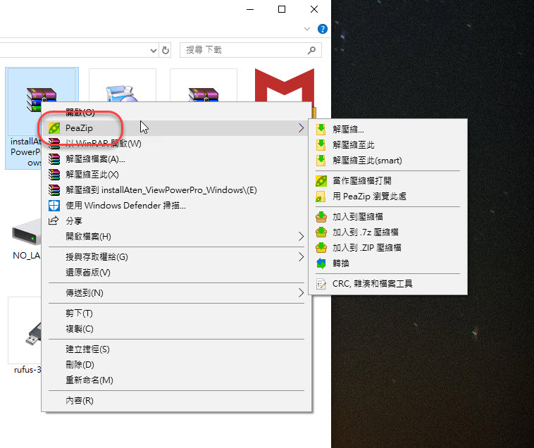 我個人還蠻喜歡他的右鍵介面,來跟 WinRAR 比一下,RAR 我一直不太懂為什麼要佔了右鍵一整排,PeaZip 則是收納在一起,指過去後再展開全部選單,其實現在很多免費壓縮軟體都做的非常好用,再怎樣也犯不著要用盜版的,其實 7-Zip 也很好用啊,大家不要再問我盜版了啦。