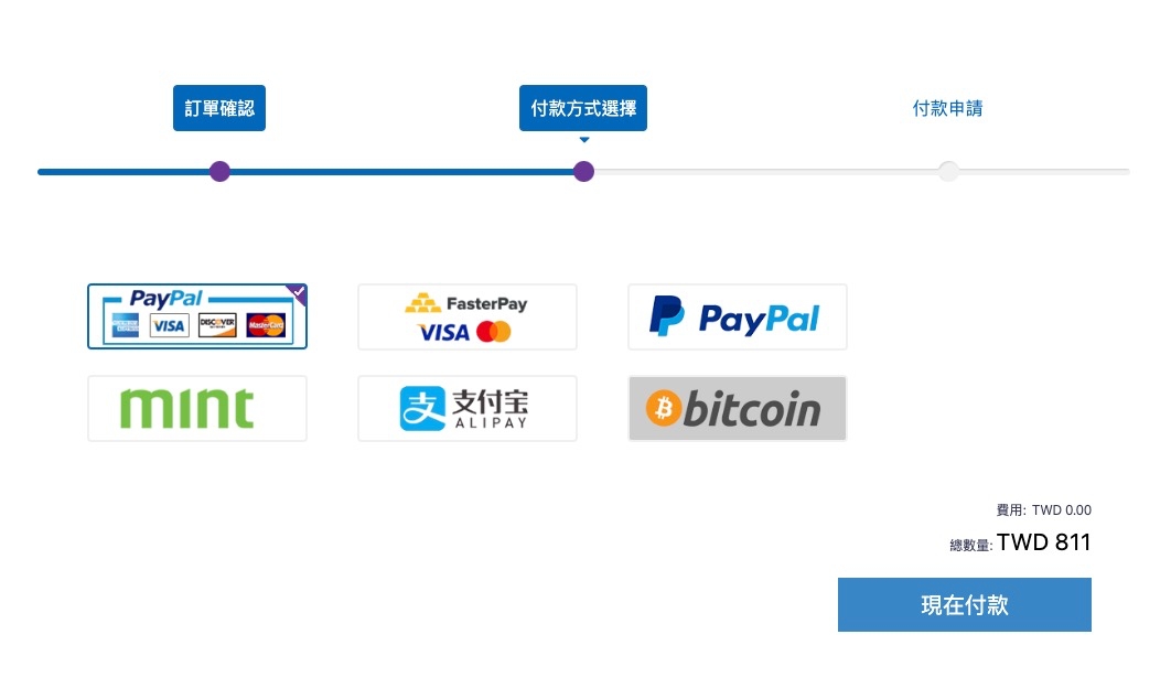 付款方式有信用卡、PayPal、Mint 跟支付寶外,現在還多了之前沒有的 FasterPay(信用卡)及比特幣。