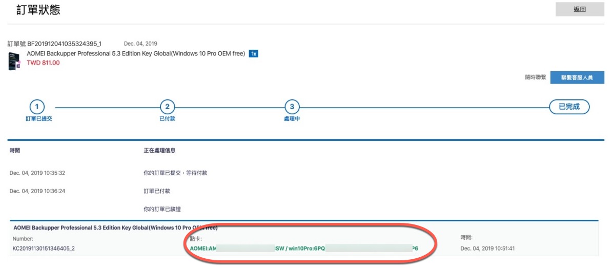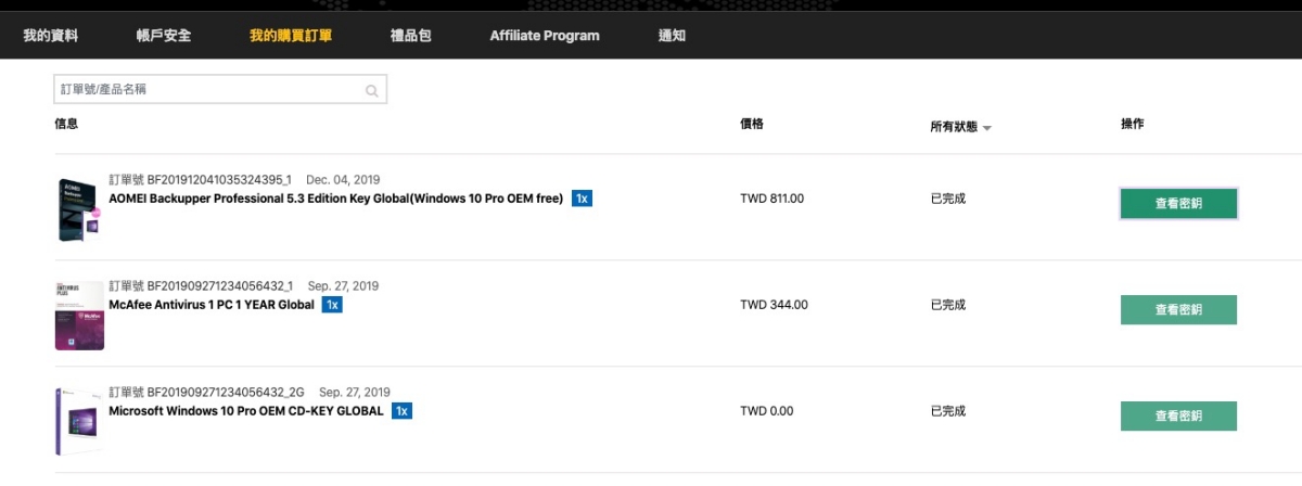 當你看到訂單「已完成」後就可以進入查看序號了,贈送的 Windows 10 序號點擊查看密鑰後,都在裡面哦。