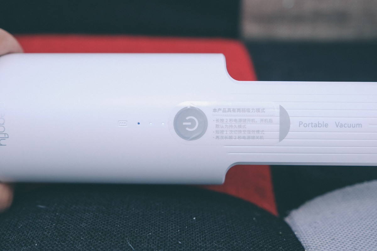 操作按鍵只有一個,長按就是開跟關,短按可以切換吸力強度,只有持久模式(一般吸力)跟強效模式(最大吸力),這邊也會顯示電源指示燈,在持久模式下,充飽電最長可以使用 25 分鐘,