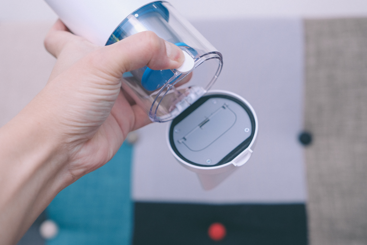 雖然倒垃圾只要按一鍵就可以傾倒,但只要有在用手持吸塵器的人都會知道一個事實,毛屑很容易卡在鋼網處下不來,如果要清理只能拆卸鋼網,但 FV2 不用拆到鋼網,只要直接轉開集塵桶就可以清理到裡面,這部份設計我也覺得很方便。