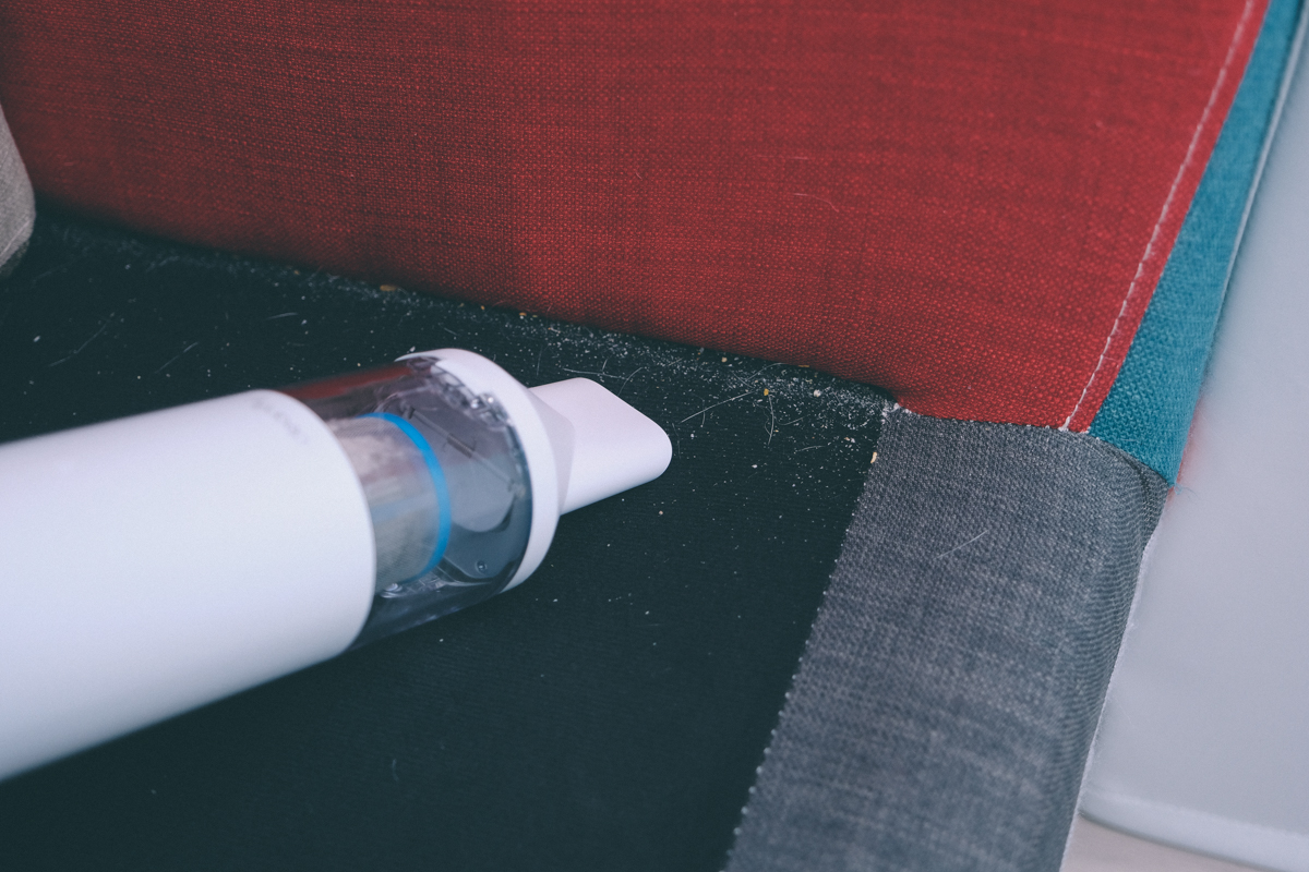 然後我就隨便的在沙發上吸了一下做測試,但老實說,在清潔沙發之前,大概前二天我才用過吸塵器吸過...