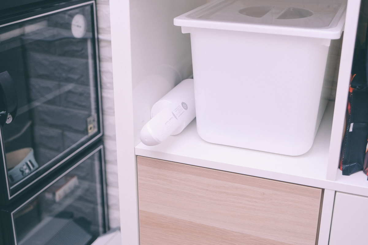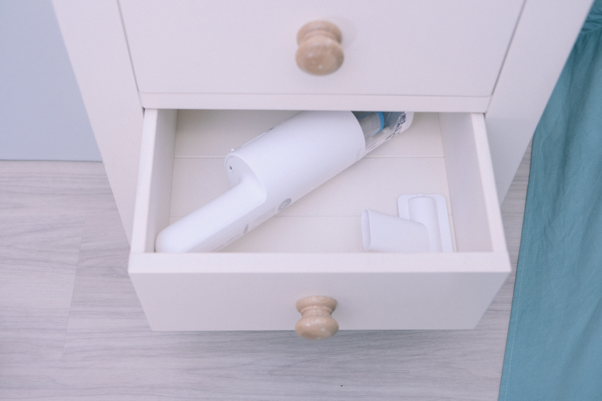 清蜓 FV2 無線吸塵器的最大重點真的是很好收納,你想放哪就放哪,不論像這樣的小抽屜。