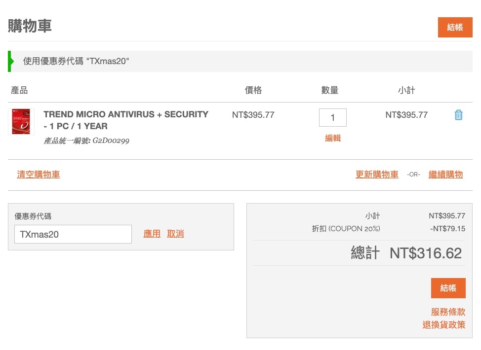 趨勢科技這款防毒軟體(一年份)來說,原本優惠是 395.77 NTD,輸入優惠券代碼後變成 316.62,然後還可以免費獲得一組 Windows 10,基本上安裝電腦要用的二大重要軟體都有了。