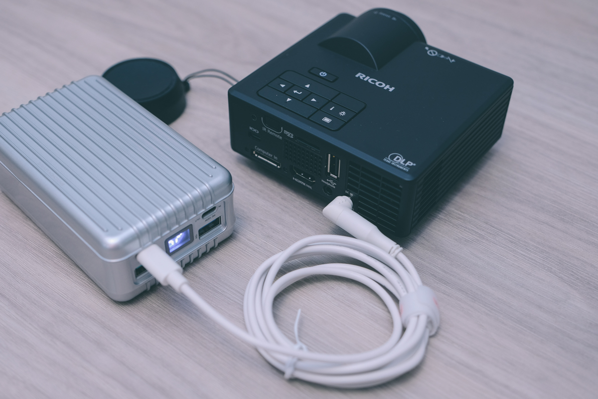另外微投影機如果想要便攜的話,一般會考慮選擇內建電池的機型,但問題就來了,內建電池重量會多不少且體積也大概就不會是掌上型了,散熱時的風扇音量就更不用提了,其實內建電池又要體積小,大概是缺點大大大於優點太多,所以最佳做法是額外接行動電源,但以 RICOH 這款微投影機來說,並不支援直接外接行動電源使用,如果你真的有需求的話,可以去買 USB 轉筆電充電頭(PD)來用,像阿湯就測試了用轉接頭接行動電源,成功啟動成功,另外要注意的是,如果你想要這樣接,行動電源要選擇支援 PD 的才能使用,因為原廠的電源變壓器供電是 65W,阿湯也提供我使用的轉接線材及行動電源給大家參考: