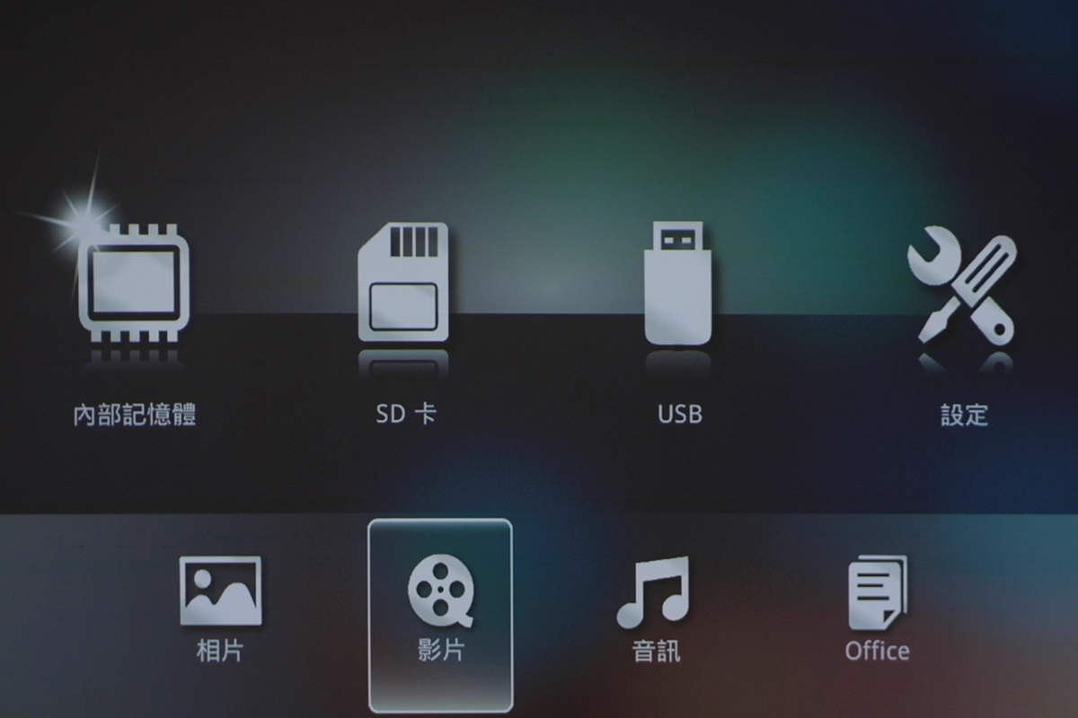 除了接 HDMI/VGA 外,可以讀取 microSD 記憶卡、USB 隨身碟等,直接播放內容,其中內部還有 2GB 的記憶體可以讓你放置一些內容來使用,比如你是要帶著去講課做簡報,就有支援 Office 的格式,可以直接播放簡報且可以用遙控器換頁。另外也能直接播放圖片、影片(不支援外掛字幕)、音樂(內建 1.5W 揚聲器)等。
