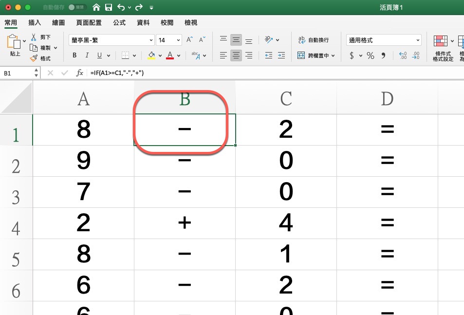 只要 A1 數字比 C1 大或等於就顯示減號,比 C1 小就顯示加號,為什麼要這樣呢?因為 A1 如果比 C1 小還有減號的話,那就會出現負數,對剛開始學加減法的小朋友來說,負數會是挺複雜的,所以我們只要加上 IF,就可以自動的加上對應的符號來計算了。