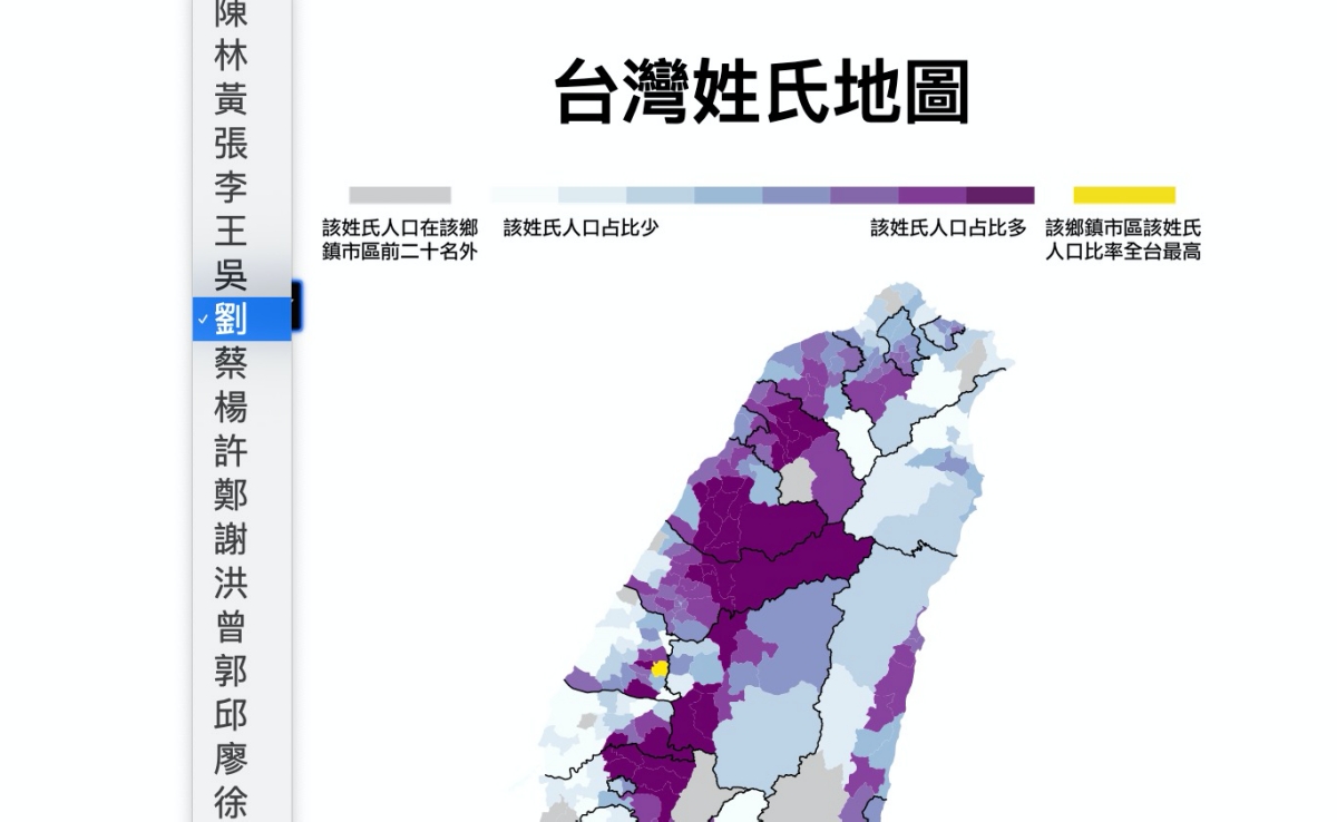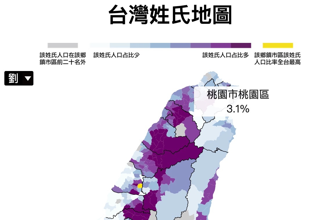 如果你把滑鼠移到該區域,還可以看到姓氏的人口比例有多少。