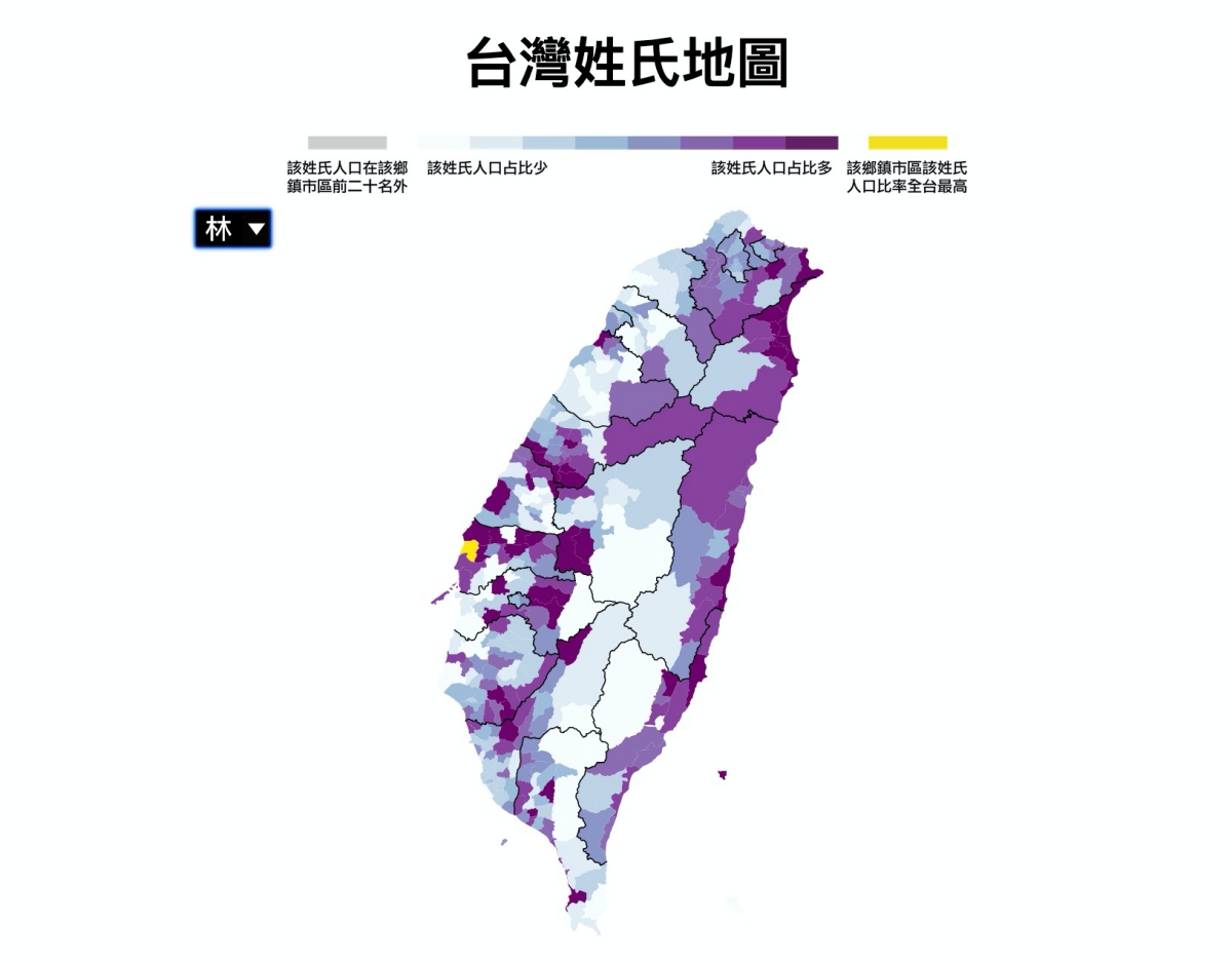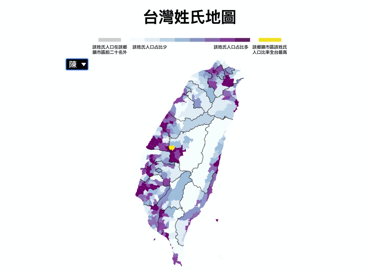 旁邊可以選擇姓氏直接查看該姓氏的分佈圖,不過就如同前面說的,這並不是全部的姓氏都有,如果你沒有在裡面,那算是比較稀有的姓氏了,物以稀為貴啊。